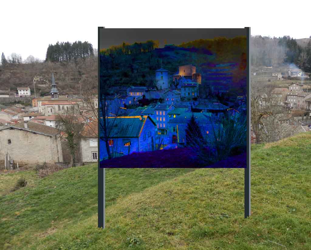 "A mesure que l'on s‘en approche, les lignes du site viennent se superposer au dessin du vitrail. La vision devient alors limpide : la ligne d'horizon définit le tracé." • Philippe Soussan "Prolongement" Photographie conceptuelle